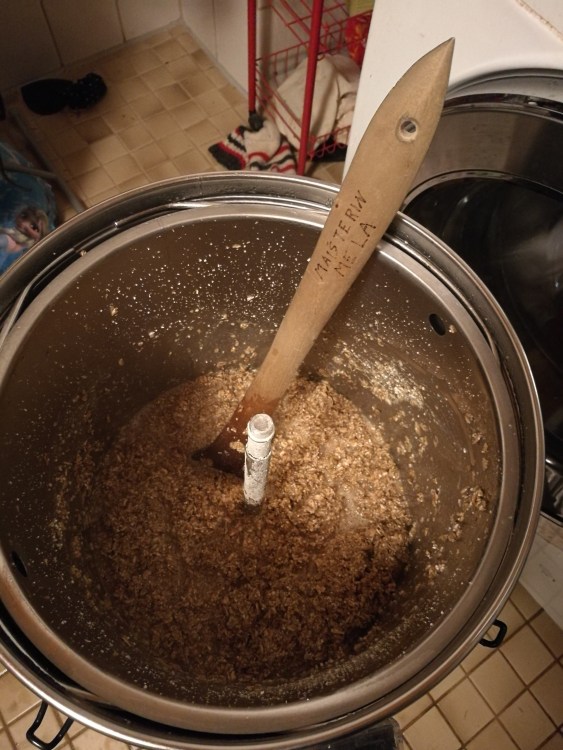 Lauantaiaamun kalenteri näytti hälyttävästi tyhjältä klo 8-12, joten ajattelin käyttää tämän ajan lambicin panemiseen. Tätä erää on tarkoitus kypsytellä kegissä ja luultavasti aloittaa tästä ja helmikuussa panemastani aiemmasta lambicista solera, jonka nimeksi kaavailin ”Aarnia”.