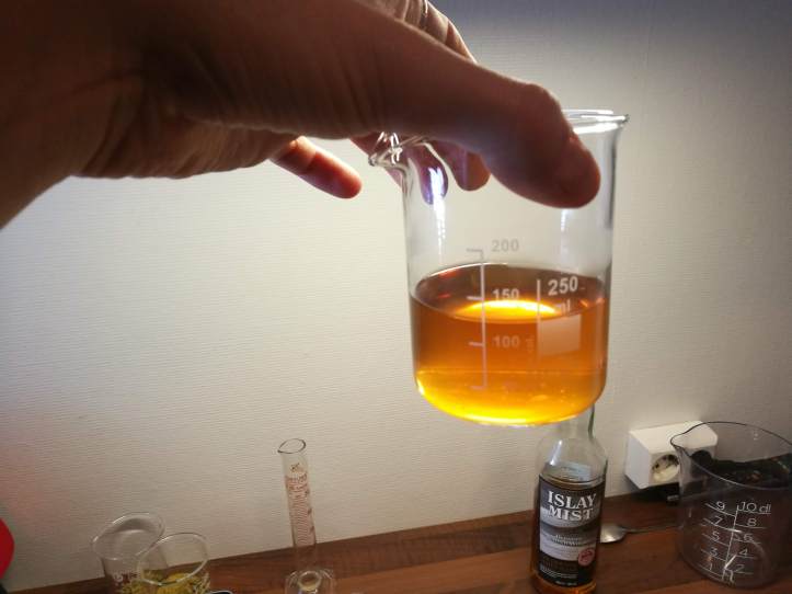 Valutuksen jälkeen otin vierrettä talteen noin desin verran ja tein tästä hot scotchyn. Kyseessä on lämpimänä nautittava drinkki, joka koostuu viskistä ja vierteestä (humaloimattomasta!). Aineksien suhteista ja käytettävästä viskilaadusta löytyy internetistä erilaisia mielipiteitä. Laitoin kaksi osaa vierrettä ja yhden osan halpaa ja kevyesti savuista skottia. Hyvää oli. Jos villasukat ovat unohtuneet jalasta ja kiehuva vierrekattila ei lämmitä panijaa tarpeeksi, niin ehkä tämä sitten lämmittää.