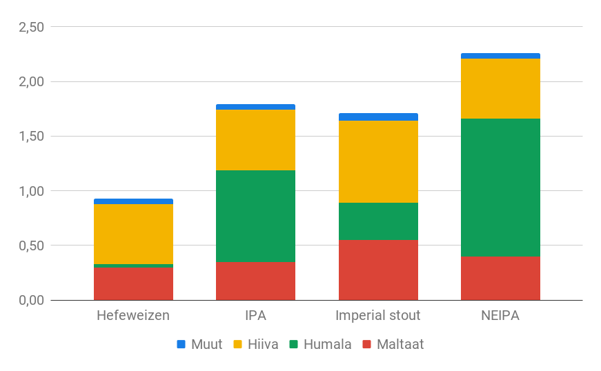 Oletetaan humalan keskimääräiseksi hinnaksi 8 euroa sadalta grammalta. Matalasti humaloidussa tyylissä (saison, hefeweizen, belgian pale ale) humalan määrä voi helposti jäädä grammaan litraa kohti, jolloin humalan osuus litrahinnasta on 8 senttiä. APAssa tai IPAssa humalaa voi mennä litraan 5 grammaa, jolloin osuus litrahinnasta olisi 40 senttiä, ja NEIPAssa 20 grammaakin on vielä järkevyyden rajoissa, jolloin osuus litrahinnasta olisi peräti 1,60 euroa.