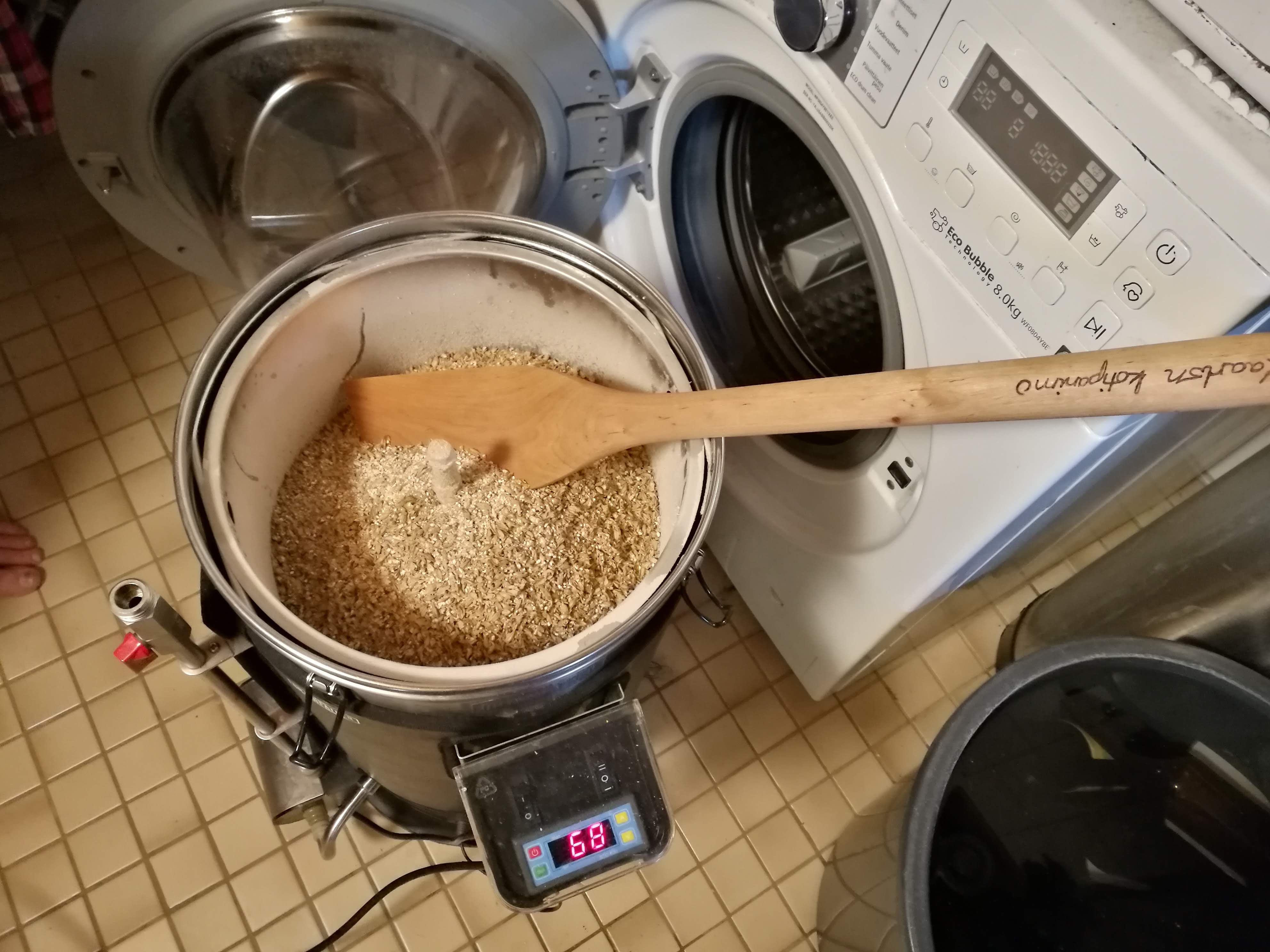 Mäskäys sujui yllätyksettömästi. Mäskäys-valutustehokkuus jäi hieman arvioitua matalammaksi 73 prosenttiin, joten päätimme pidentää keiton reseptin ehdottamasta 90 minuutista kahteen tuntiin. Näin saimme ominaispainon osumaan lukemaan 1,070. BYO:n reseptissä ominaispainoksi annetaan 1,073 ja alkoholimääräksi 8,2 %, mikä tuntuu vähän hassulta, koska kyseessä on olevinaan klooniresepti ja Alesmithin IPAssa on oikeasti prosenttiyksikkö vähemmän alkoholia.