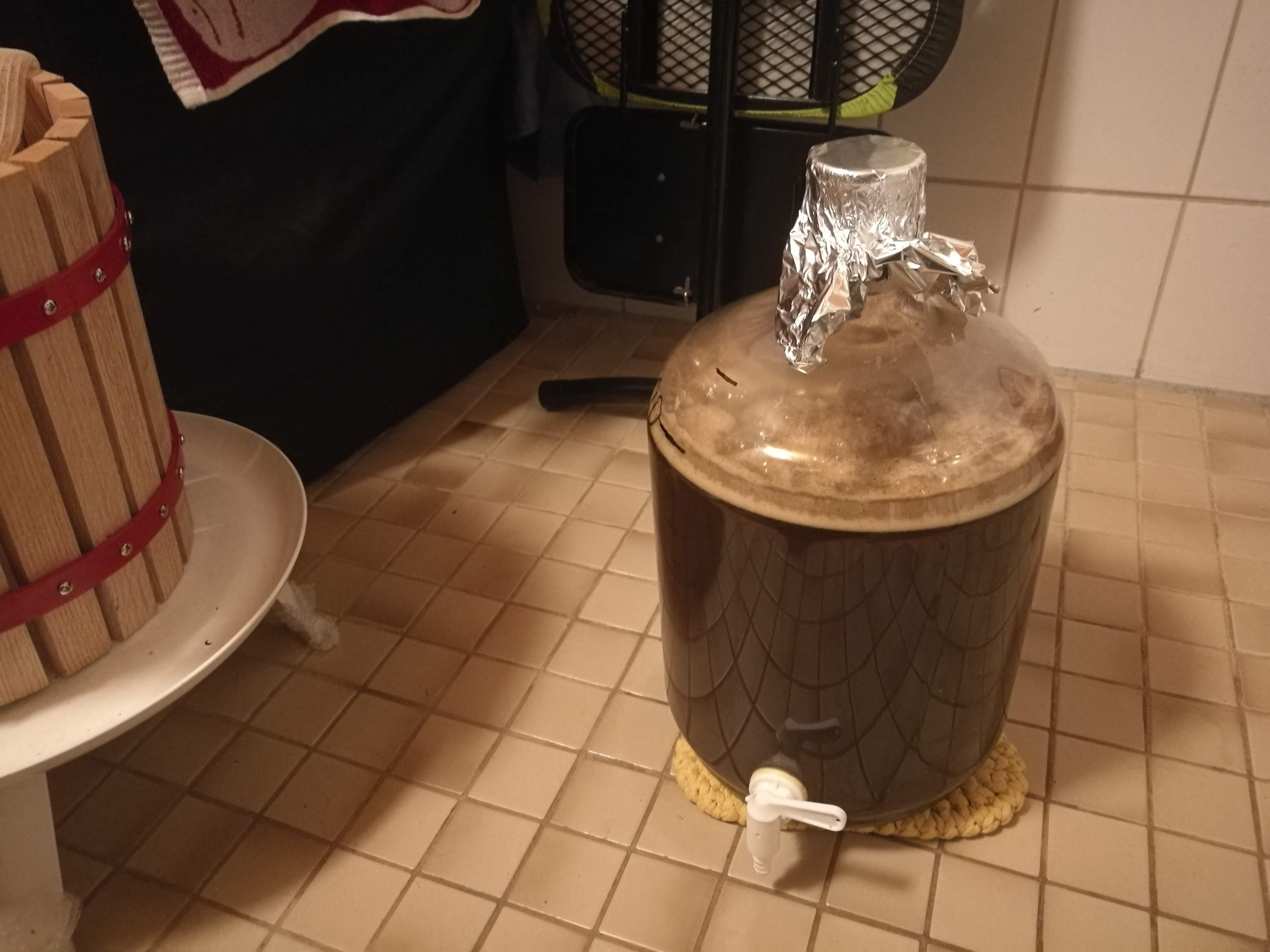 Jätin hiivauksen jälkeen käymisastian yöksi kylpyhuoneen lattialle. Kylpyhuoneessa on lattialämmitys, joka piti oluen ehkä vajaassa 30 asteessa starttaamisen ajan. En myöskään laittanut vielä vesilukkoa, vaan peitin astian foliolla. Ajatuksena tässä oli mahdollistaa hiivalle hyvät, happirikkaat olosuhteet käymisen alkamisen ajaksi. Aamulla käyminen olikin jo hyvässä vauhdissa, joten siirsin käymisastian työhuoneeseeni, jossa lämpötila on tähän aikaan vuodesta siinä 20 asteen pinnassa.