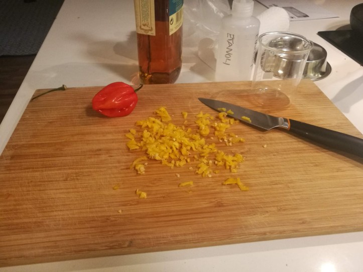 Aluksi desinfioin veitsen, leikkuulaudan, hanskat ja lasin. Silppusin yhden keltaisen habaneron pieneksi, laitoin lasiin ja kaadoin päälle noin desin viskiä. Annoin tämän seoksen olla noin vuorokauden ajan ennen ensimmäistä maistelusessiota. Hyvin tuo kapsaisiini tuntui liukenevan, sillä kun kokeilin sekoittaa yhden osan tätä habaneroviskiä 99 osaan olutta, niin oluesta tuli aivan liian tulista juotavaksi.
