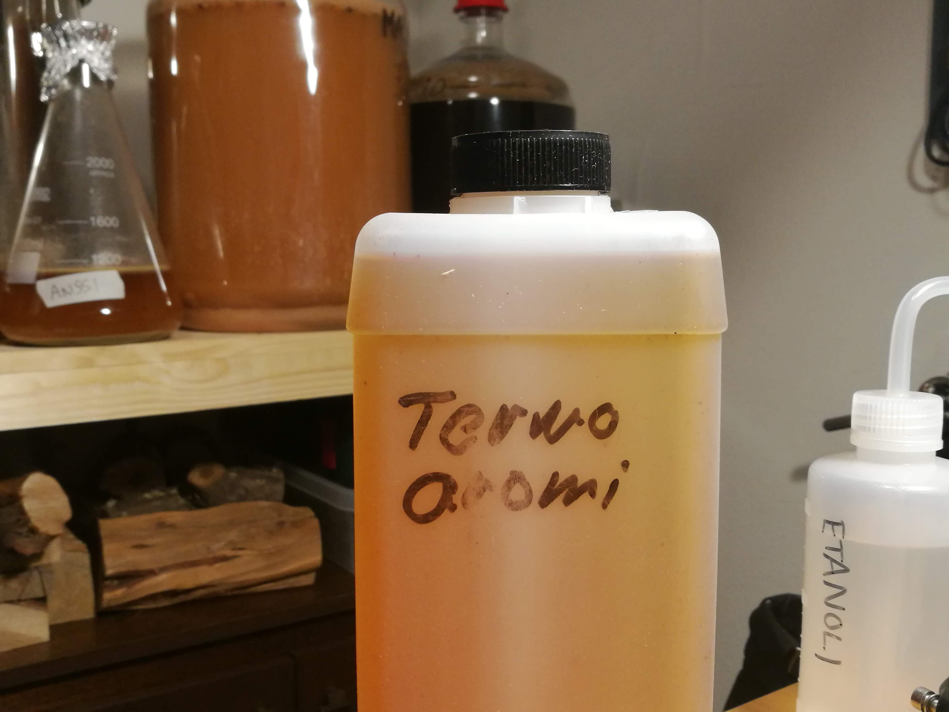 Vaan eipä tuo maustaminen tuohon jäänyt. Hieman sattumalta tilasin Lentiiran Terwalta terva-aromia samoihin aikoihin kun tämä olut oli käymässä. Testatessani oluen tulisuutta käymisastiasta otetulla näytteellä kokeilin samalla, miten tuo aromi tässä toimisi. Terva on maku, josta olen aina pitänyt, joten ei ihme että pidin myös tästä. En halunnut tervastakaan kovin dominoivaa elementtiä, joten lisäsin käymisastiaan 3 ml terva-aromia. Tämä tuotti hyvin hentoisen tervan häivähdyksen. Ah, ja keksin juuri, että terva tuotetaan kovassa lämpötilassa puuta pyrolysoimalla, joten Old Fires -teeman ympärillä edelleen pyöritään!