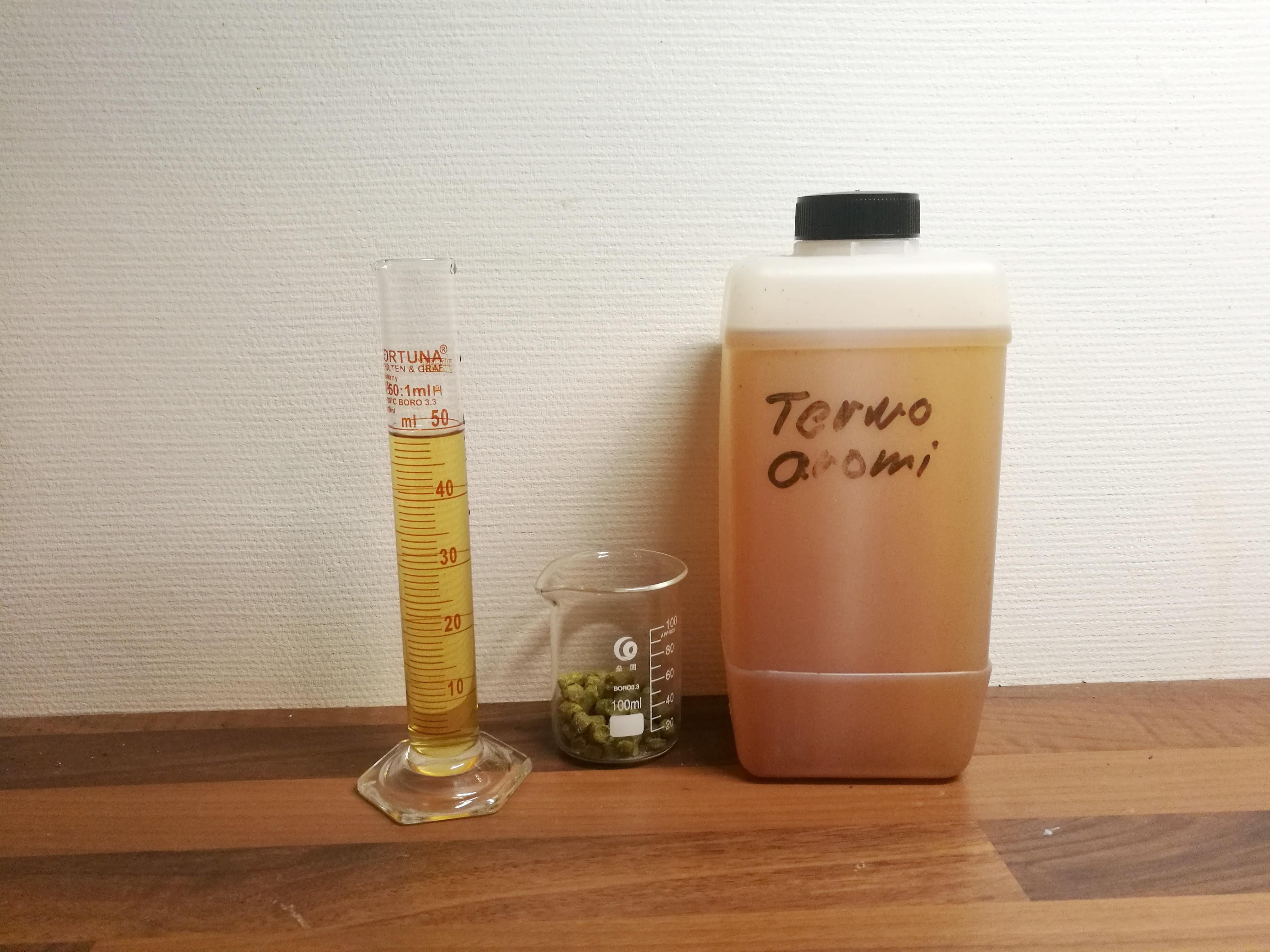 Aiemmin panemaani habanerokveiktervaportteriin pipetoin terva-aromia suoraan käymisastiaan sekoitussuhteessa 3:10000. Tuossa vaiheessa en vielä tiennyt aromin koostumusta, steriiliyttä tai antibakteerisuutta. Tähän olueen sitä oli tarkoitus laittaa aika paljon enemmän, sillä aiemmassa oluessa tervan maku oli vain hentona häivähdyksenä. Siispä päättelin, että järkevintä olisi laittaa aromi vierteen sekaan keiton aikana, jotta valtaosa siinä mahdollisesti olevista mikrobeista kuolisi korkeassa lämpötilassa. Laitoin aromia 4:1000 -sekoitussuhteessa eli yli kymmenkertaisen määrän tuohon aiempaan olueen verrattuna.