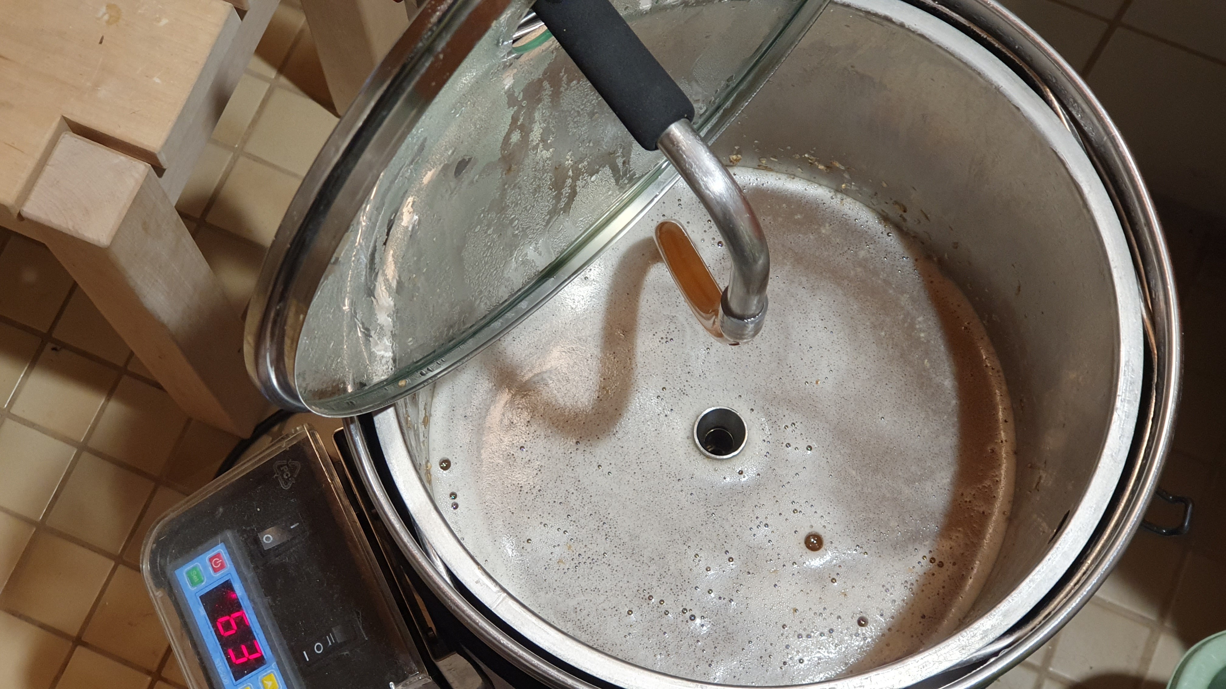 Mäskäyslämpötilaa pudotin aiemman reseptin 66 asteesta 63 asteeseen. Kuvittelin tällaisen mallaspohjan mäskäytyvän pikavauhtia, mutta tunnin jälkeen vierre näytti edelleen aika samealta. Tein joditestin ja kyllä se siltä näytti, että tärkkelystä vielä olisi jonkin verran jäljellä. Päätin pidentää mäskäyksen 80 minuuttiin. Tämän jälkeen vierre olikin jo huomattavasti kirkkaampaa.